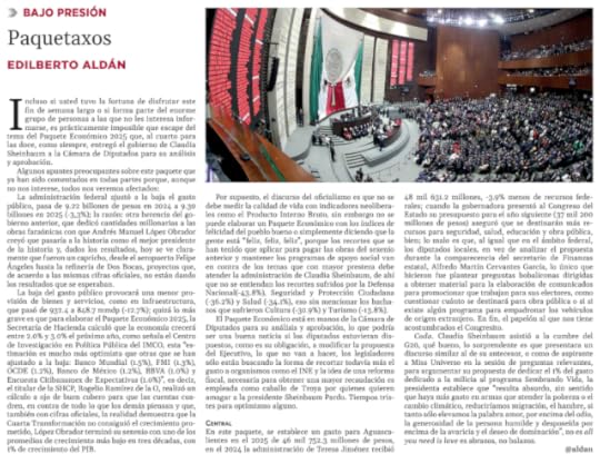 Incluso si usted tuvo la fortuna de disfrutar este fin de semana largo o si forma parte del enorme grupo de personas a las que no les interesa informarse, es prácticamente imposible que escape del tema del Paquete Económico 2025 que, al cuarto para las doce, como siempre, entregó el gobierno de Claudia Sheinbaum a la Cámara de Diputados para su análisis y aprobación.