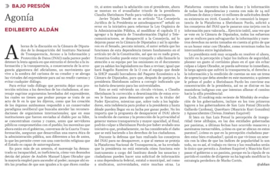La instrucción fue confirmada en la conferencia matutina de la presidenta, “el INAI sí desaparece y entra una función en un área especial de la Secretaría Anticorrupción y de Buen Gobierno; y se mantienen los criterios que formalmente constituyeron al INAI, sin necesidad, pues, de estos grandes organismos, grandes gastos, viajes al extranjero”, de nada sirvió el esfuerzo de los consejeros del INAI por preservar, al menos, la Plataforma Nacional de Transparencia o participar en la elaboración de leyes secundarias para la protección de datos.