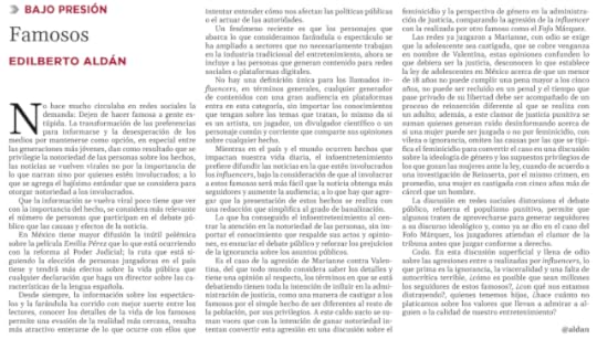 Es el caso de la agresión de Marianne contra Valentina, del que todo mundo considera saber los detalles y tiene una opinión al respecto, los términos en que se está debatiendo tienen toda la intención de influir en la administración de justicia, como una manera de castigar a los famosos por el simple hecho de ser diferentes al resto de la población, por sus privilegios. A este caldo sucio se suman voces que con la intención de ganar notoriedad intentan convertir esta agresión en una discusión sobre el feminicidio y la perspectiva de género en la administración de justicia, comparando la agresión de la influencer con la realizada por otro famoso como el Fofo Márquez.