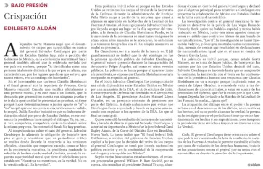 Coda. El general Cienfuegos tiene otros casos sobre el que podría ser cuestionado, la falta de rendición de cuentas de las Fuerzas Armadas le permite escabullir el bulto por casos de violación de los derechos humanos, insistir en las acusaciones contra el general por su nexos con el narcotráfico es desviar la atención de lo importante.