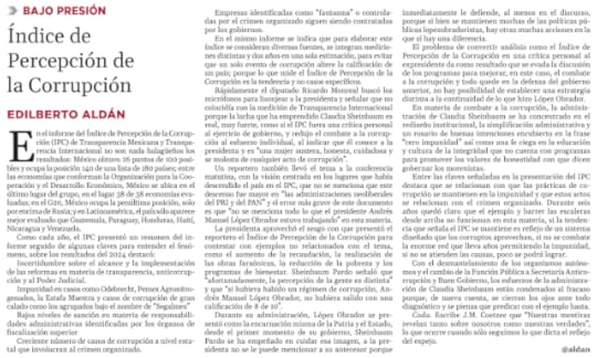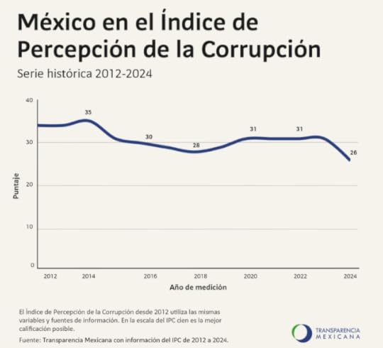 En el informe del Índice de Percepción de la Corrupción (IPC) de Transparencia Mexicana y Transparencia Internacional no son nada halagüeños los resultados: México obtuvo 26 puntos de 100 posibles y ocupa la posición 140 de una lista de 180 países; entre las economías que conforman la Organización para la Cooperación y el Desarrollo Económico, México se ubica en el último lugar del grupo, en el lugar 38 de 38 economías evaluadas; en el G20, México ocupa la penúltima posición, solo por encima de Rusia; y en Latinoamérica, el país sólo aparece mejor evaluado que Guatemala, Paraguay, Honduras, Haití, Nicaragua y Venezuela.Como cada año, el IPC presentó un resumen del informe seguido de algunas claves para entender el fenómeno, sobre los resultados del 2024 destacó: