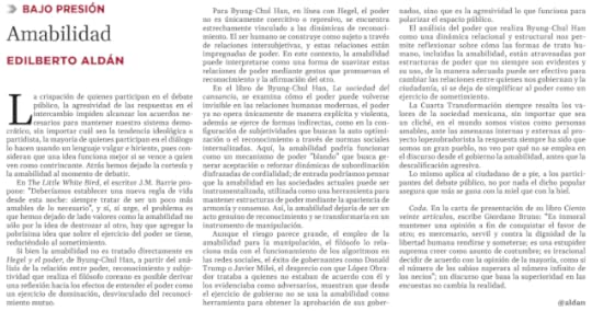 Aunque el riesgo parece grande, el empleo de la amabilidad para la manipulación, el filósofo lo relaciona más con el funcionamiento de los algoritmos en las redes sociales, el éxito de gobernantes como Donald Trump o Javier Milei, el desprecio con que López Obrador trataba a quienes no estaban de acuerdo con él y los evidenciaba como adversarios, muestran que desde el ejercicio de gobierno no se usa la amabilidad como herramienta para obtener la aprobación de sus gobernados, sino que es la agresividad lo que funciona para polarizar el espacio público.