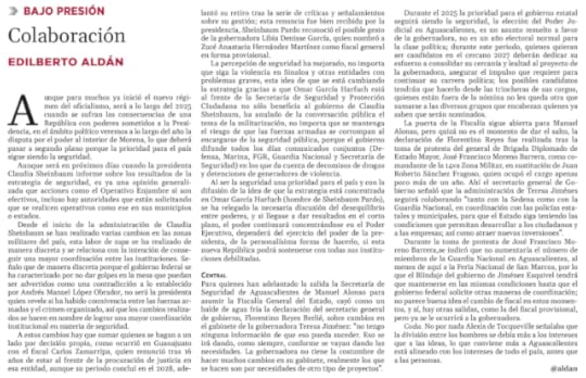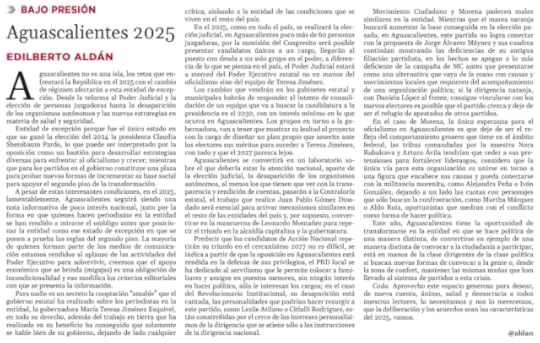 Coda. Querido lector, tengo otra cantidad de especulaciones para el 2025 en Aguascalientes, no quiero abusar de su confianza y extenderme, ya habrá ocasión en la siguiente columna de presentarle esos escenarios, así que con mis mejores deseos para el año que viene: ánimo, salud y democracia.