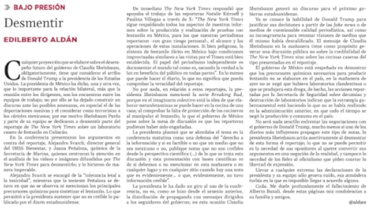 No será nada sencillo enfrentar las negociaciones con el gobierno de Donald Trump, mucho menos si uno de los diarios más influyentes propagan este tipo de notas, la presidenta Sheinbaum actúa asertivamente al desmontar de esta forma el reportaje; lo que no se puede permitir es la necedad de sus opositores al querer convertir sus argumentos en una negación de la realidad, y tampoco la necedad de los fieles al oficialismo que piden coartar la libertad de expresión.