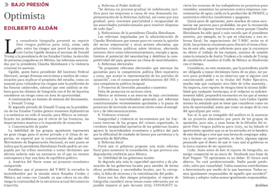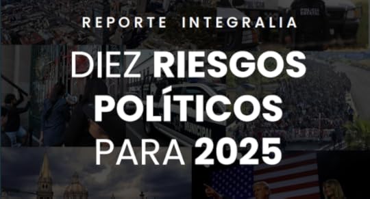 La consultoría Integralia presentó su reporte Diez riesgos políticos para 2025, como cada año; entre los riesgos que prevé la empresa de Luis Carlos Ugalde destaca el ascenso de Donald Trump a la presidencia de los Estados Unidos, la elección de personas juzgadoras en México, las reformas anunciadas por la presidenta Claudia Sheinbaum y la violencia criminal en ascenso.