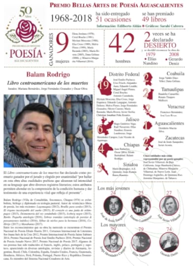 De 1968 al 2018, el Premio Bellas Artes de Poesía Aguascalientes se ha entregado a 51 poetas; se ha reconocido a 49 títulos pues en dos ocasiones se ha declarado desierto (en 1979 se realizó un homenaje a Elías Nandino, y en el 2008 se entregó a la obra de Gerardo Deniz).En 2018, El Libro centroamericano de los muertos fue declarado como poemario ganador por el jurado y elegido por unanimidad “por hallar en esta obra altas cualidades poéticas que alcanzan tal intensidad en su lenguaje que abre diversos registros literarios; estos atributos permiten ahondar en la comprensión de la condición humana y dar testimonio de una experiencia vital que refleja el presente”, de acuerdo al acta firmada por Mariana Bernárdez, Jorge Fernández Granados y Óscar Oliva.Balam Rodrigo (Villa de Comaltitlán, Soconusco, Chiapas-1974) es exfutbolista, biólogo y diplomado en teología pastoral. Autor de veinticinco libros de poesía, los más recientes: Logomaquia (2012), Braille para sordos (2013), El órgano inextirpable del sueño (2015), El corazón es una jaula de relámpagos (2015), Desmemoria del rey sonámbulo (2015), Iceberg negro (2015), Bardo. Pequeña antología (2016), Sobras reunidas (antología de poesías & pensamientos inútiles) (2016), Silbar de mirlos para la hermusa (2016), Colibrije (2017) y Marabunta (2017).