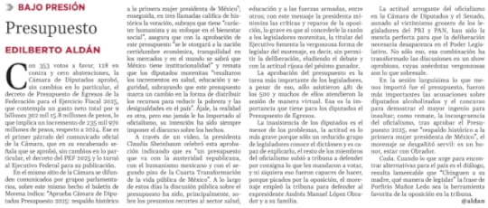 A través de un video, la presidenta Claudia Sheinbaum celebró esta aprobación indicando que es “un presupuesto que va con la austeridad republicana, con el humanismo mexicano y con el segundo piso de la Cuarta Transformación de la vida pública de México”. A lo largo de estos días la discusión pública sobre el presupuesto ha sido, principalmente, sobre los presuntos recortes al sector salud, educación y a las fuerzas armadas, entre otros; con este mensaje la presidenta minimiza las críticas y reparos de la oposición, lo grave es que al concederle la razón a los legisladores morenitas, la titular del Ejecutivo fomenta la vergonzosa forma de legislar del morenaje, es decir, sin permitir la deliberación, eludiendo el debate y con la actitud rijosa del pésimo ganador.