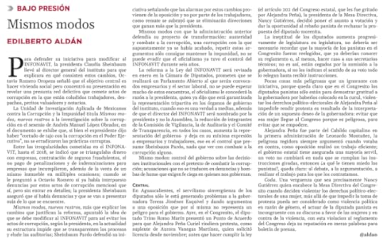 La reforma a la Ley del INFONAVIT será revisada en enero en la Cámara de Diputados, prometen que se realizará un Parlamento Abierto al que serán convocados empresarios y el sector laboral, no se puede esperar mucho de estos encuentros, el oficialismo le concederá la razón a la presidenta, quien ya dijo que está garantizada la representación tripartita en los órganos de gobierno del instituto, cuando eso es una verdad a medias, además de que el director del INFONAVIT será nombrado por la presidenta y no la Asamblea, la reducción de integrantes de la Comisión de Vigilancia, la de Auditoría y el Comité de Transparencia, en todos los casos, aumenta la representación del gobierno y deja en su mínima expresión a empresarios y trabajadores, ese es el control que presume Sheinbaum Pardo, nada que ver con combate a la corrupción alguno.