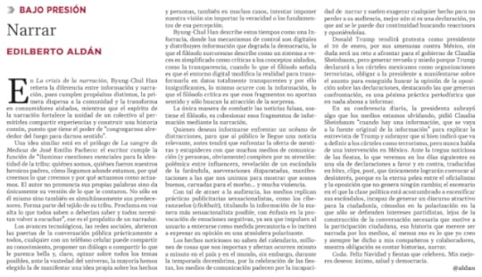 En su conferencia diaria, la presidenta subrayó algo que los medios estamos olvidando, pidió Claudia Sheinbaum “cuando hay una información, que se vaya a la fuente original de la información” para explicar la entrevista de Trump y subrayar que si bien indicó que va a definir a los cárteles como terrorismo, pero nunca habla de una intervención en México. Ante la tregua noticiosa de las fiestas, lo que veremos en los días siguientes es una ola de declaraciones a favor y en contra, traducidas en bites, clips, post, que únicamente lograrán convocar al desinterés, porque es la eterna pelea entre el oficialismo y la oposición que no genera ningún cambio; el escenario en el que la clase política está acostumbrado a escenificar sus escándalos, incapaz de generar un discurso atractivo para la ciudadanía, cómodos en la polarización en la que sólo se defienden intereses partidistas, lejos de la construcción de la conversación necesaria que motive a la participación ciudadana, esa historia que merece ser narrada por los medios, al menos eso es lo que yo creo y siempre he dicho a mis compañeros y colaboradores, nuestra obligación es contar historias, narrar.
