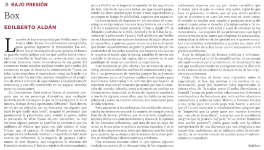 En Countdown: Paul contra Tyson, el youtuber asegura que es un personaje disruptivo, que cualquier persona puede conseguir lo que se proponga con fe en sí mismo, trabajo duro y optimismo delirante: “Está dentro de mí ser un peleador, ser un disruptor, ser alguien que hará lo que nadie más hará”, aseguró el personaje que promocionó la plataforma para vender la pelea. Sobre la actuación de Mike Tyson en este encuentro, no hay reclamo alguno porque se justifica su presencia por los millones de dólares que ganó con sólo subirse al ring. Dinero que, al parecer, el Canelo Álvarez no necesita, porque ya ha rechazado montar un espectáculo luchando contra un influencer. A la mayoría de quienes disfrutamos de este deporte, nos congratula la decisión del boxeador mexicano, el box no requiere de estos montajes; pero a Netflix no le importa la opinión de los seguidores del box, sino la de los anunciantes, así que ya está preparando un show similar para atraer a más espectadores y aumentar su franja de publicidad, negocios son negocios.