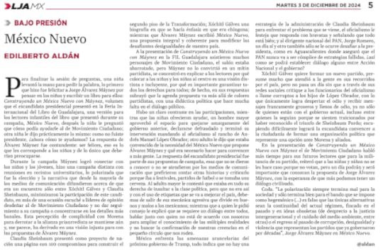 A la presentación de Construyendo un México Nuevo con Máynez en la FIL Guadalajara asistieron muchos personajes de Movimiento Ciudadano, el salón estaba abarrotado, pero Máynez no lo convirtió en un mítin partidista, se concentró en explicar a los lectores por qué colocar a las niñas y los niños al centro es una visión distinta e incluyente, por qué es importante garantizar todos los derechos para todos; de hecho, en sus respuestas subrayó que la agenda propuesta va más allá de colores partidistas, con una didáctica política que hace mucha falta en el diálogo público.