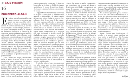Coda. Perdón por intolerarlos, El miedo y la masa, título original de este texto, se publicó en La Jornada Aguascalientes, el 7 de diciembre de 2008; en ese entonces me presenté ante Jorge Álvarez Máynez con esta columna como propuesta para colaborar con el diario que, en contra de todo, llegó a Aguascalientes para cambiar la forma de hacer periodismo en la entidad. En 2012, Francisco Aguirre me confió la dirección editorial de este proyecto. En 2019, a causa de la censura, el periódico tuvo que cambiar su nombre, es el quinto aniversario de LJA.MX. Más allá de los membretes, a lo largo de 16 años este medio ha sido casa de los periodistas más brillantes, de los columnistas más lúcidos, un espacio de libertad que puedo llamar mi casa, aquí, con quienes estuvieron y están se construye un país mejor. Gracias por tanto.