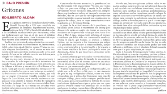 A pesar de la actitud sensata de la presidenta, no ha faltado quien la urja a encontrarse con Trump para demostrarle quién es quién, sin tomar en cuenta los resultados de la apresurada visita que hizo Justin Trudeau a Mar-A-Lago, apenas hubo señalado el premier canadiense que había sido una conversación excelente, Trump le espetó que Canadá se anexara a Estados Unidos; eso no importa a los bravucones que exigen a la presidenta que encare al estadounidense, porque están acostumbrados a la polarización y la bravata, a una forma machista de hacer politiquería antes que diplomacia, donde lo que importa es demostrar quién grita más fuerte.