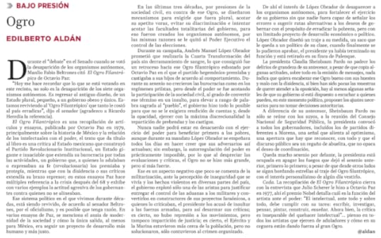 Coda. La recopilación de El Ogro Filantrópico cierra con la entrevista que Julio Scherer le hizo a Octavio Paz en 1977, ahí el premio Nobel detalla cuál es la función del artista ante el poder: “El intelectual, ante todo y sobre todo, debe cumplir con su tarea: escribir, investigar, pensar, pintar, construir, enseñar. Ahora bien, la crítica es inseparable del quehacer intelectual”... pienso en todos los artistas que ejercen de aduladores y cómo en su ceguera están dando fuerza al gran Ogro.