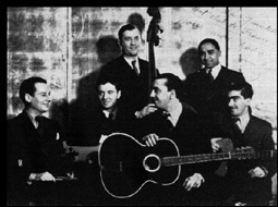 Reinhardt’s true impact began when he formed the Quintet of the Hot Club of France with violinist Stephane Grappelli in Paris in 1934. With a unique backing of bass and two rhythm guitars, Django spun glorious leads, often in tandem with Grappelli, whom the guitarist also backed with incredibly propulsive rhythm playing. Like all true jazz greats, Django’s music was a remarkable blend of perfect technicality, soulful feel and good humor. Seventy years later, his playing still sounds fresh and original, filled with bent notes and a fantastic vibrato, standard techniques today which were virtually unheard of in his day.