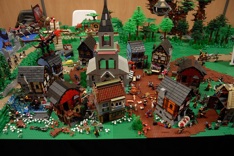 Jeux de rôles, jeux de plateaux, travailleurs sur cuir (à se pâmer), ventes de costumes et d'armes en tous genres, ateliers de grimages, de dessins et d'écriture et taverne. Ambiance assez classique (quoique, il y avait un coin morts-vivants tout de même), médiéval, elfique avec des créatures en tous genres dont notamment le samedi des "chats" habillés montés sur des échasses qui cherchaient des oiseaux à capturer et distribuaient des graines à tout le monde pour les attirer. Des princesses, des chevaliers ou des commerçants, des oreilles pointus évidemment, à peine moins qu'à Trolls et Légendes entièrement consacré à ce genre. Une énorme arène au milieu du quartier recevait des combats de chevaliers, les essais de catapultes ou les jeux de Trollball. Dans un coin de la salle, une énorme maquette de la Terre du Milieu en Lego représentait un port, un château et son village de part et d'autre d'une rivière. Avec un smartphone, il était possible de voter pour un scénario catastrophe qui modifiait la maquette deux fois dans la journée. Les détails étaient fabuleux et il était d'autant plus rigolo d'apercevoir dans ce dédale de pièces deux bob l'éponge, deux chaperons rouges (dont un décapité en fin de journée) et un king kong au faitage du donjon [image error] Un autre coin de la salle était dédié à la série Donjon de Naheulbeuk et là, la maquette du château à cinq étages et sa forêt en contrebas était en Playmobil. Superbe de détails encore. Et chacun pouvait participer à la création d'une grande fresque de Naheulbeuk en Lego aussi ; il suffisait de réaliser un losange de pièces assemblées selon un modèle, ajouté à la fresque après.