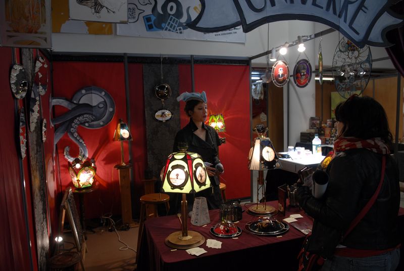 Enfin NAUTILUS. Ce fut mon coup de cœur du week-end. Ici pas d'ateliers, pas de jeux de plateaux mais des décors à profusion : des petits salons, des machines géniales (dont celle à remonter le temps [image error] ), un bout du Nautilus, un atelier et des magasins de ventes de chapeaux, de corsets, de colliers et d'éléments de décoration hyper-originaux, mélange de lampes lalique, d'art nouveau et de steampunk avec des crabes et des araignées métalliques sous globe. J'ai eu une petite frustration sur le manque de ventes d'accessoires quand on voyait l'imagination débridée des personnes costumées qui paradaient dans tous les quartiers : quantité d'armes, fusils, fioles, sacs et lunettes fantastiques. Certains personnes alliaient si bien le romantisme, la technologie et la sensualité qu'il y avait de quoi retourner la tête. Là, encore un peu de Lego en îles flottantes dans les airs et les Playmobils digne des mystères de l'Ouest. Et une superbe fresque faite sur les deux jours par Julien Delval, Manchu et Yoz.