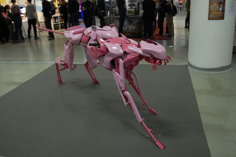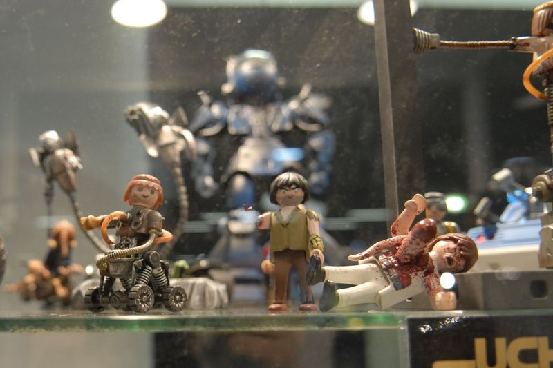 TECKLAB m'a surprise parce que je n'ai pas l'habitude de voir de la robotique et des jeux vidéos sur les salons où je suis invitée. Je n'ai pas essayé de jeux vidéos, je ne suis pas très douée mais j'ai imaginé plus d'un ami complètement déchainé dans cette trentaine de stands à disposition où la seule file d'attente vraiment grande le samedi était celle du jeu Strike suit zéro (avec masque à réalité virtuelle). Je ne pense pas que ce confort d'utilisation durera longtemps si le bouche à oreille fonctionne pour les prochaines éditions de ce salon (deux heures le dimanche déjà [image error] ). Dans ce quartier, il y avait aussi des maquettes dont notamment une DeLorean, avec over-board, casquette et chien en peluche, et plus loin, un chien rose taillé dans une moto (impossible de me souvenir de la référence du film). Sur un autre stand, deux petits robots dansaient et pouvaient même faire le poirier, un automate d'1m50 non loin de là. Pas de costume spécial ici, une rémanence des Stars Wars et de super-héros seulement et une nouvelle vitrine de Playmobils un fois de plus supercustomisés en terminator, morts-vivants et autres supplices qu'on a toujours imaginé faire à ses petites poupées de plastique trop sages [image error]