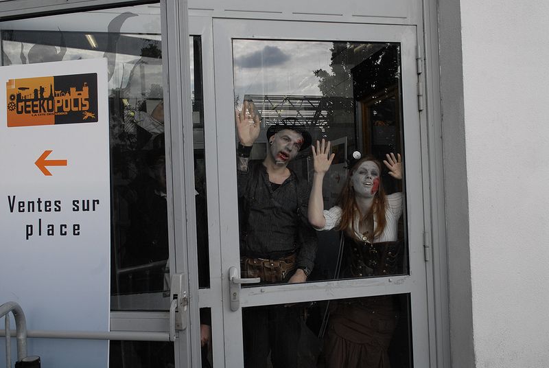Et savez-vous ce que nous avons eu pour clôturer le salon ? Une marche de Zombies ! Une demie-heure avant la fermeture, j'ai remarqué un noble zombie passer sans agressivité, puis 5 min plus tard, une femme des cavernes aux mêmes traits éteints, puis 5 min plus tard un roi déchu, puis encore plus tard une baby doll décomposée. Ils ont fini par se regrouper, enfler leur envie de mordre, puis ce fut la déferlante, pas trop rapide mais tout de même, on sentait le besoin de partir. Toutes les personnes en costume orienté militaire (gardes impériaux, forces rebelles, GI, soldats steampunk) ont commencé à nous évacuer et à nous protéger. L'effet était super, encore plus amusant quand les zombies scotchaient derrière les vitres du salon alors que nous étions tous dehors. Très beau final.