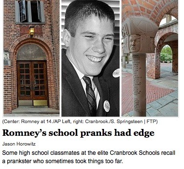 Specifically, I want to talk about the use of the word “prank” to describe what presidential candidate Mitt Romney is accused of doing to a classmate at his prep school years ago. The news, splashed all over the Washington Post website today and spread far and wide online, quotes several of Romney’s former classmates in describing an alleged attack on a student who was different.