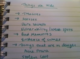 My notebooks are full of things like this, as well as collections of names, descriptions of clothes I borrowed from strangers to save for my characters later on, blurted “what-ifs” that I scribbled because I thought they might help solve story problems, funny things my kids and their friends said, all mixed in with a scattering of to-do lists, grocery lists, and things like this…