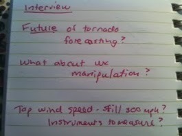 Here’s a list of questions I wanted to remember to ask one of the tornado specialists I went to interview in Oklahoma when i was researching EYE OF THE STORM…