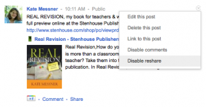When you share something that's not Public, you'll want to make sure it doesn't get shared beyond the circles with whom you want to share it. To do that, you'll need to disable the share feature that allows people to share your post. Right after you share the post, click on the little arrow to the upper right side of that post, and select "disable reshare" from the pull-down menu. Like this…