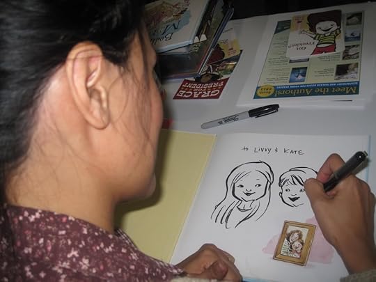 When it was time to sign books, I got to sign with talented illustrator Leuyen Pham, who actually sketched each child for whom a book was being signed if there was a photograph available. I could have sat there watching her draw with her Japanese brush pen for hours.