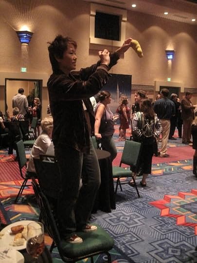 Lisa also posted a bazillion photos from NCTE/ALAN on her blog. She asked everyone to balance Peepy on their heads. I saw this happen a dozen or more times and was amazed that no one questioned or even hesitated. We all dutifully and carefully balanced her stuffed Easter candy on our heads and posed for photos. I think this speaks to the power of Lisa's charisma, and it makes me hope that she only uses her powers for good because seriously...imagine if she wanted to take over the world or something. Everyone would just say, "Okay!" and balance Peeps on their head, and follow her. Check out her blog...you'll see what I mean.