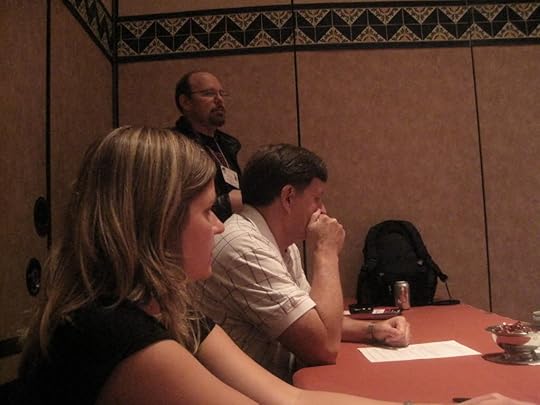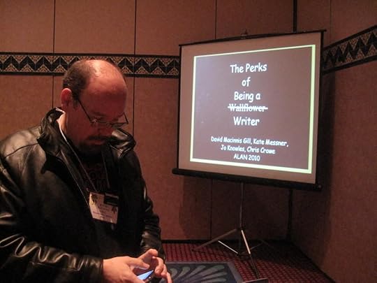 Monday morning, I sat in on the ALAN sessions & got to hear great authors like Rebecca Stead, David Levithan, Rachel Cohn, and Darren Shan, and that afternoon, I presented a breakout panel on helping young writers discover their voices, along with David Macinnis Gill, Jo Knowles, and Chris Crowe. Here's David, our fearless leader, getting ready for the workshop.