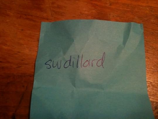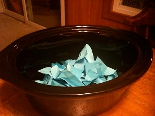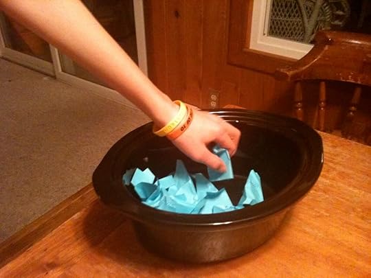 I may have mentioned that I am now the proud owner of a crock pot. (This is not as exciting as having Brian illustrate, but it's still exciting. It made chicken and potatoes while I was teaching today.) So I put all the names in the stoneware from the crock pot and had my son take a break from writing code for his latest iPhone application to choose a winner.