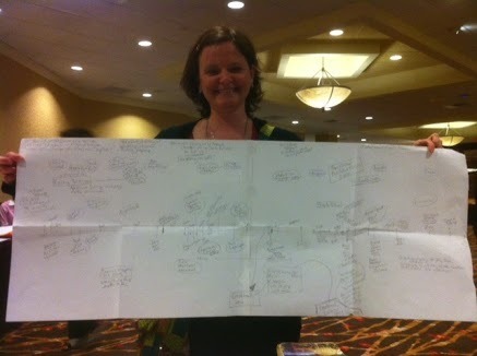 We talked about using maps, timelines, and charts as revision tools. After the session, Michelle Cusolito came by my signing table to show me the timeline she was using to keep track of events in her novel-in-progress. Michelle and I share a deep and abiding love for really big paper…