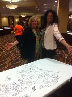 I had a few people waiting with books when I arrived for the author signing, so I dug out my pens and got right to work. I kept wanting to say hello to Dawn Metcalf and Hazel Mitchell and see what they were doodling on their tablecloth at the next table over. But every time I started to get up, someone else came with a book. Finally, I got to see their masterpiece — a fantastical interpretation of…my signing line, complete with a wild array of characters holding books!