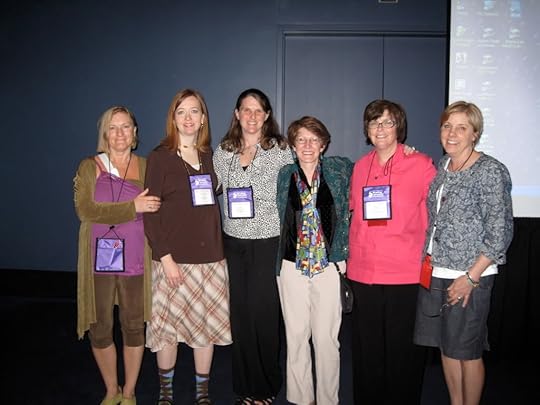 This morning started early, with a really great tomato-mushroom-spinach omelet and a cab ride to a convention center that was already swarming with excited teacher-librarian-reader-author-publisher types. My presentation on Skype author visits was part of the Teachers' Choice Symposium; here's our whole crew.