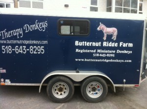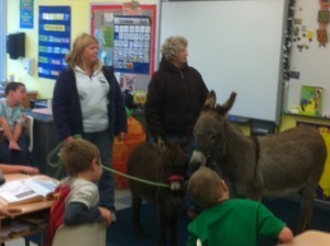 …and thought, “Oh, dear.” I’ve been told that I give a pretty entertaining presentation, but there’s no way I can compete with miniature donkeys. But it turns out the donkeys were here for their own event, a special presentation arranged for one of the third grade classrooms that had been reading about therapy dogs. These are therapy donkeys, and I got to visit them to say hello.