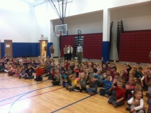 After the donkeys went home, the third graders headed to the gym for our author visit. Both groups I worked with today — the K-2 students and the 3rd-6th grade crew — were just fantastic. I can always tell when kids are enthusiastic readers and writers because of the great questions they ask. After my first presentation to the younger group, one of the boys came running back to the gym a few minutes later. “This is for you,” he said.