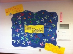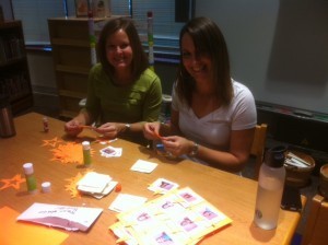 In this picture, they’re working on something I thought was too cool not to share. They create a teacher wish-list board, with pictures of all the teachers and tiny folders where they can put slips of paper with the titles of books they’d like for their classrooms. Parents who visit the book fair check out the board to find their child’s teacher and take a slip if they’d like to purchase a book for the class library. Kristin and Rachel say by the end of the book fair, those slips of paper are almost always gone, and the kids have great new books to read in their classrooms. Neat, huh?