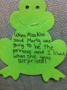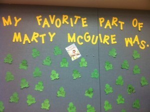 I talked with the kids about how reading made me a writer, shared some of my favorite research stories, from kissing frogs to exploring a tropical rain forest, and then the students had great questions. My favorite inquiry of the day? “When you kissed that frog (research for a frog-kissing scene in Marty McGuire) did you like it?”