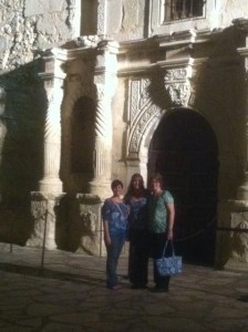Mission accomplished! From left to right, that’s Natalie Watts, me, and Cari Young. It’s fascinating to me that this gorgeous historic site is right in the middle of downtown San Antonio, next to a mall, in fact.