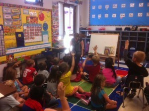 After lunch today, I spent some time in individual classrooms, visiting 5th graders who hadn’t seen a presentation but wanted to know about research and writing, and chatting with first graders who won a “private Q and A session” in the library drawing.
