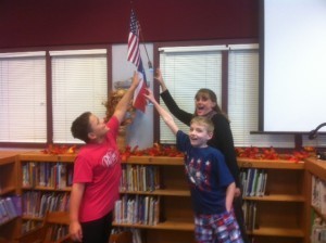 I also had a little fun, informal time with kids at the library later on. Charlie and Cole are both reading my mystery, CAPTURE THE FLAG, so they challenged me to a game.