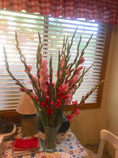 Now for the September question. The photo above is meaningful to me because gladiolas in late summer bring back sweet memories of my mother. Her birthday was the first week of September. We lived at the edge of town with a farm across the road. They grew gladiolas and had a stand on the highway nearby every year. A dollar for a bunch of glads. My brother and I always saved our nickels and dimes and bought her a bouquet for her birthday. Her friends knew this and gave her the large glass vase in the photo to hold this yearly gift. Now do you have something such as gladiolas that bring back memories of a gift given or gift received? Please share.I really enjoyed hearing from my readers–you. As usual I will choose a few to include in my monthly newsletter and gift an ebook to those few. I’d love to hear your stories!–Lyn