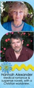Today my guest is Author Hannah Alexander. This is a pen name for a married couple who write together! Neat. And they are a very neat couple–Cheryl and Mel. I am going to share about their latest book, a historical, The Wedding Kiss. They are a double threat in more ways than one. They write both historical and contemporary romantic suspense. Anyway, I always like to post more than just book info so I copied a recent blog Cheryl wrote on a group blog she participates in. Here's Hannah: