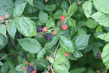 It is my custom to pick blackberries in the heat of the day. Perhaps I relish discomfort: the heat, the muggy late-June or early July weather, the thorny canes interspersed with other thorny canes and exuberant vines, poison ivy among these. I always end up scratched, sweaty, sunburned, and itchy; but I end up with blackberries.