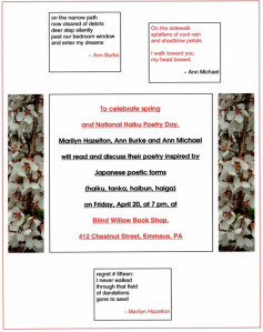 The reading Friday at Blind Willow Bookshop, a lovely used bookstore specializing in literature and unusual or rare books, combined the voices and perspectives of three poets who are exploring Japanese poetic forms.