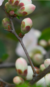 The strangely warm weather around this equinox has sped spring along. Above, one of my favorite ornamental shrubs, a quince (Chaenomeles speciosa) in the named variety "Tokyo Nishiki." I love its pale blossoms that lack the orange-y hue of the more common varieties of chaenomeles.