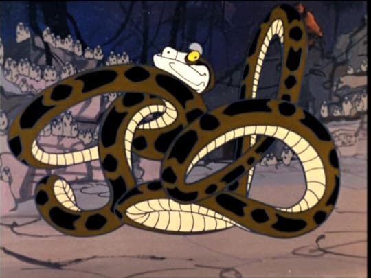 Довольно давно получил письмо с благодарностями за старую статью про Маугли. Автор, Роман Кобзарев, в частности рассказал, что в танце Каа Роман Давыдов спрятал свою монограмму. А кроме того, прислал открыточку собственного изготовления, которая изображает постановку пиесы (по мотивам мультфильма) - весёлыми таки человечками из КВЧ. С разрешения автора воспроизвожу с огромной радостью: