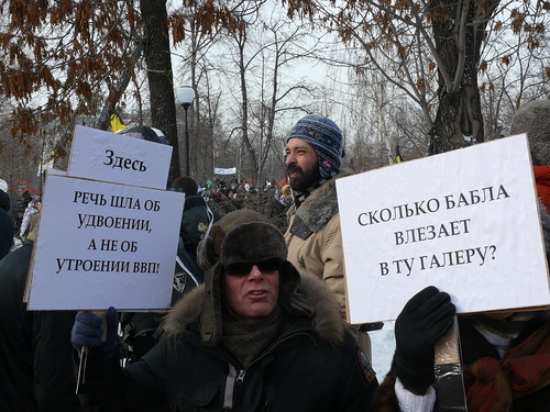 Шел с друзьями и нес лозунг про бабло и галеру - лозунг рисовал не я, поэтому точного текста не помню. Приятель нес "Мы договаривались про удвоение, а не утроение ВВП"