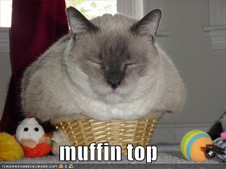 Tugging, heaving, sweating–she got the majority of her workout just getting dressed! And when she finally poured her tree-trunk body into those itty bitty pants, she looked just dreadful. Her ass was flattened out even more and muffin top burst forth from her waistband like lava spewing out of a volcano.