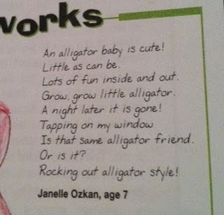 Unless you're Robert Frost, your shit needs to rhyme, kid. You call this a poem?? It doesn't make any goddamn sense. When's the last time you saw an alligator tap on anything? Go on Janelle, I'll wait while you try to come up with some idiotic answer. And why is an alligator fun inside? Pervert.